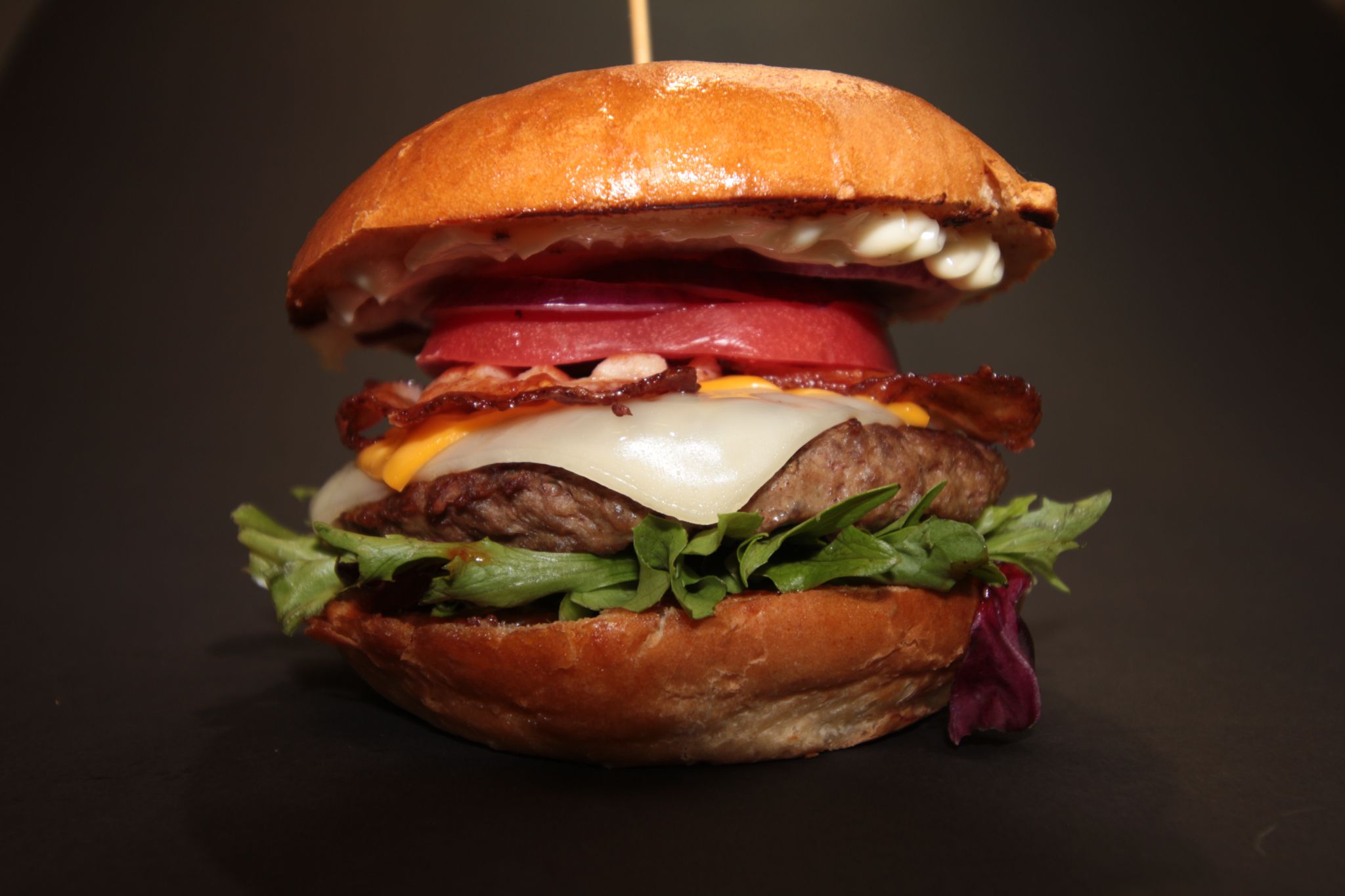 Frytki, bułka, sos bbq, majonez, sałata, wołowina, ser, bekon, pomidor, ogórek, cebulka