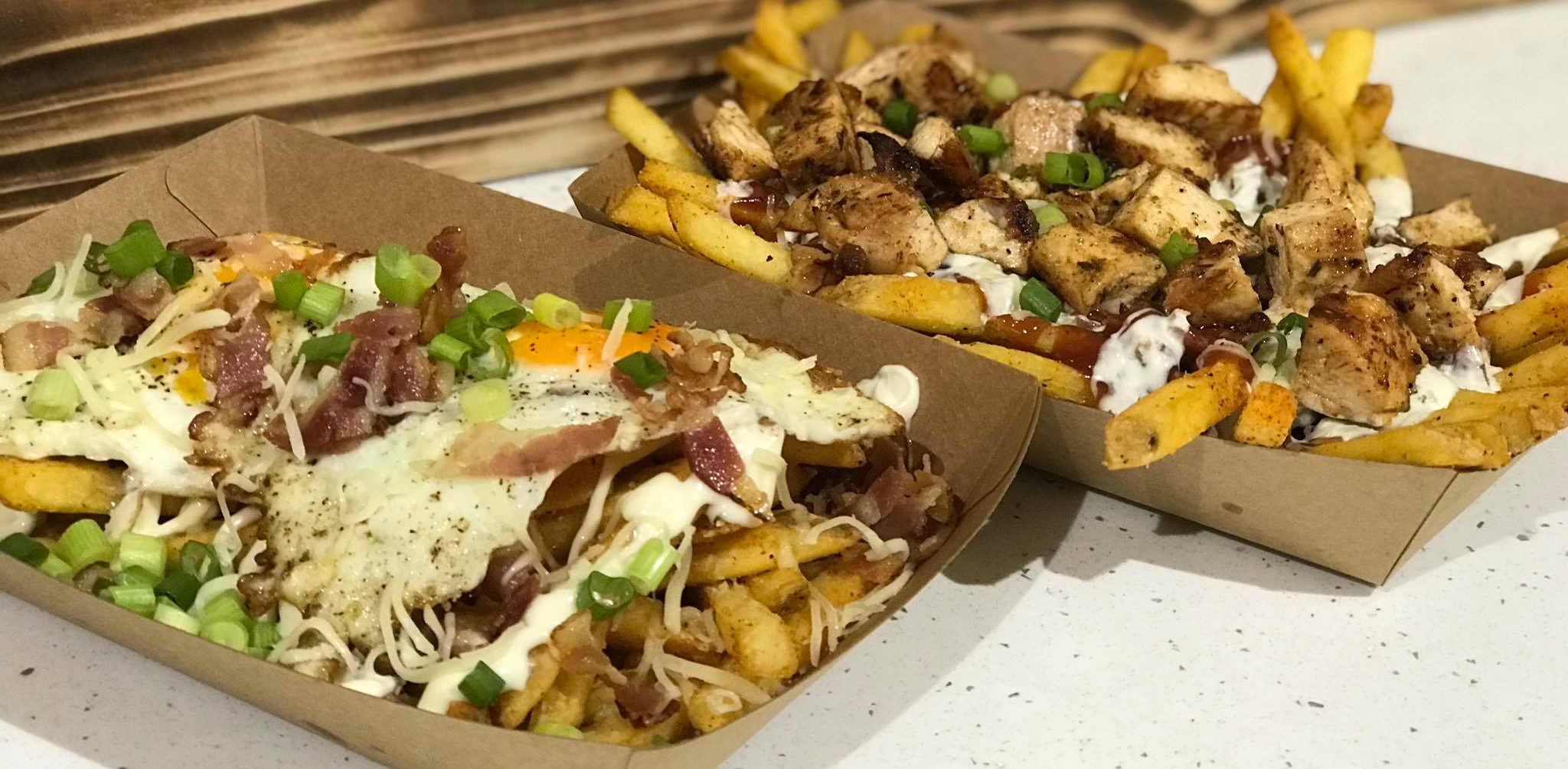 Frytki, 2 jaja, bekon, ser, cebulka, sos czosnkowy